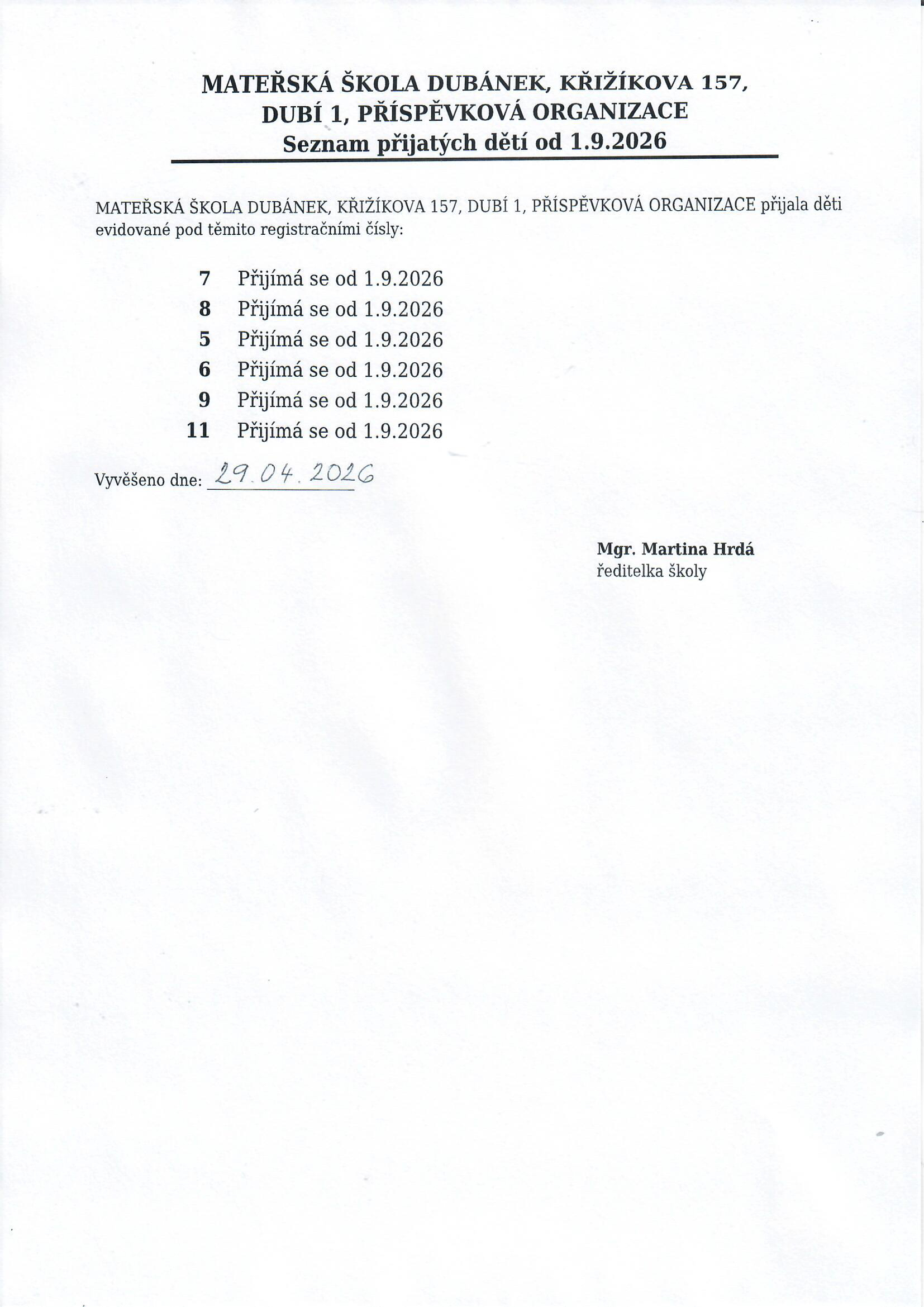 MATEŘSKÁ ŠKOLA DUBÁNEK, KŘIŽÍKOVA 157, DUBÍ 1, PŘÍSPĚVKOVÁ ORGANIZACE